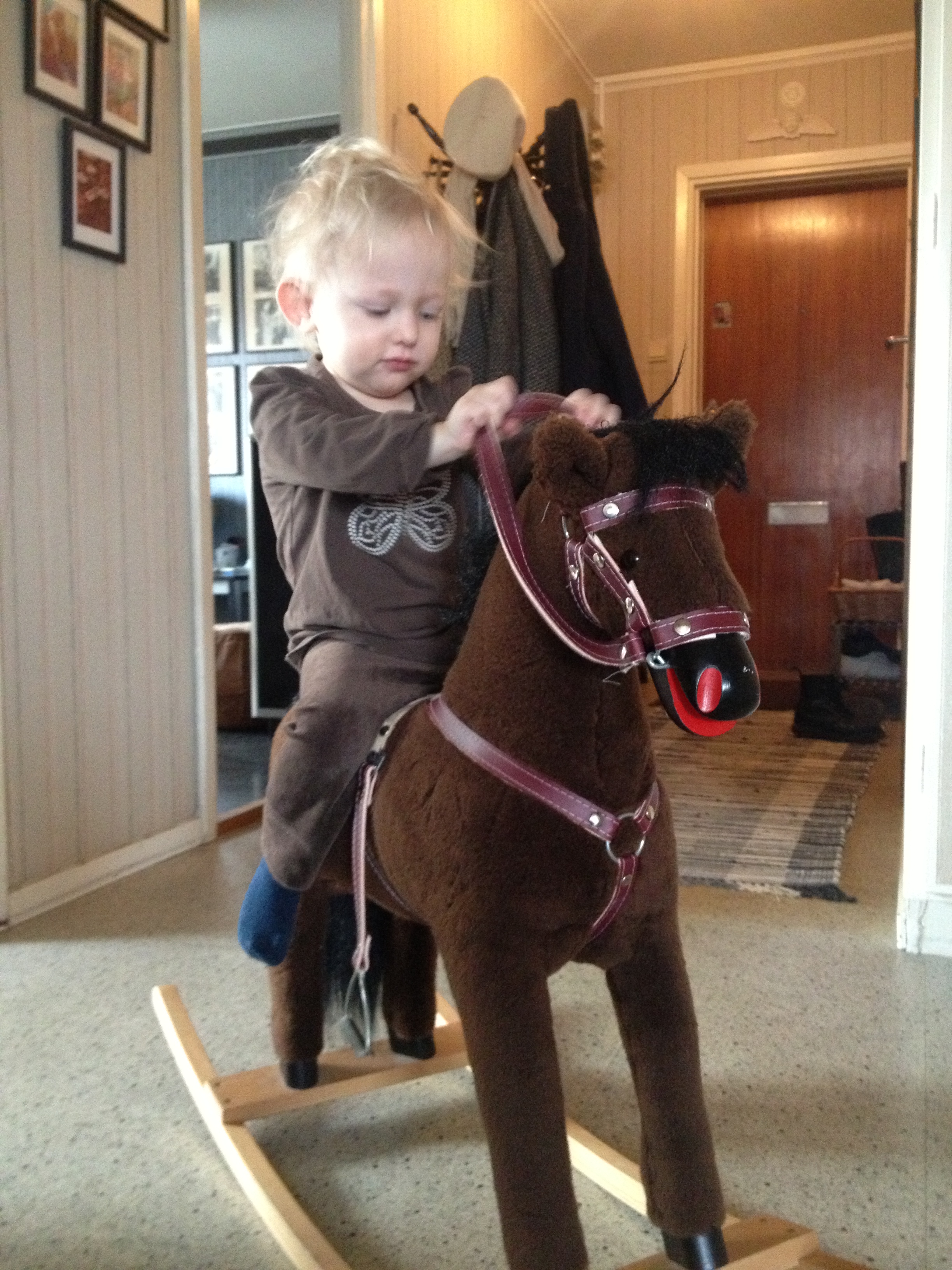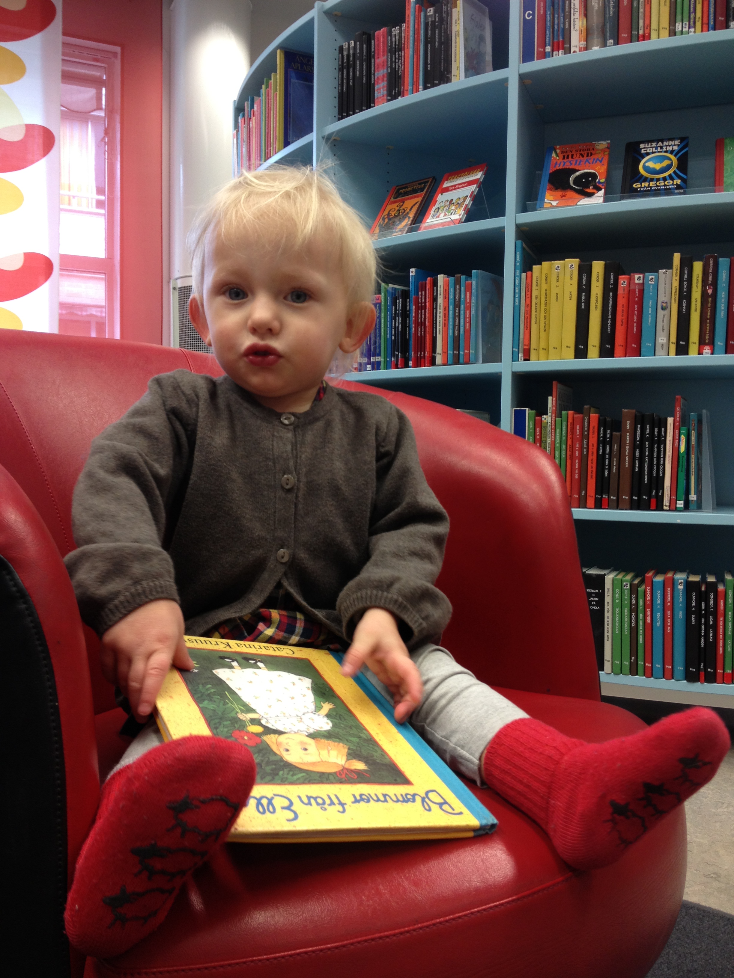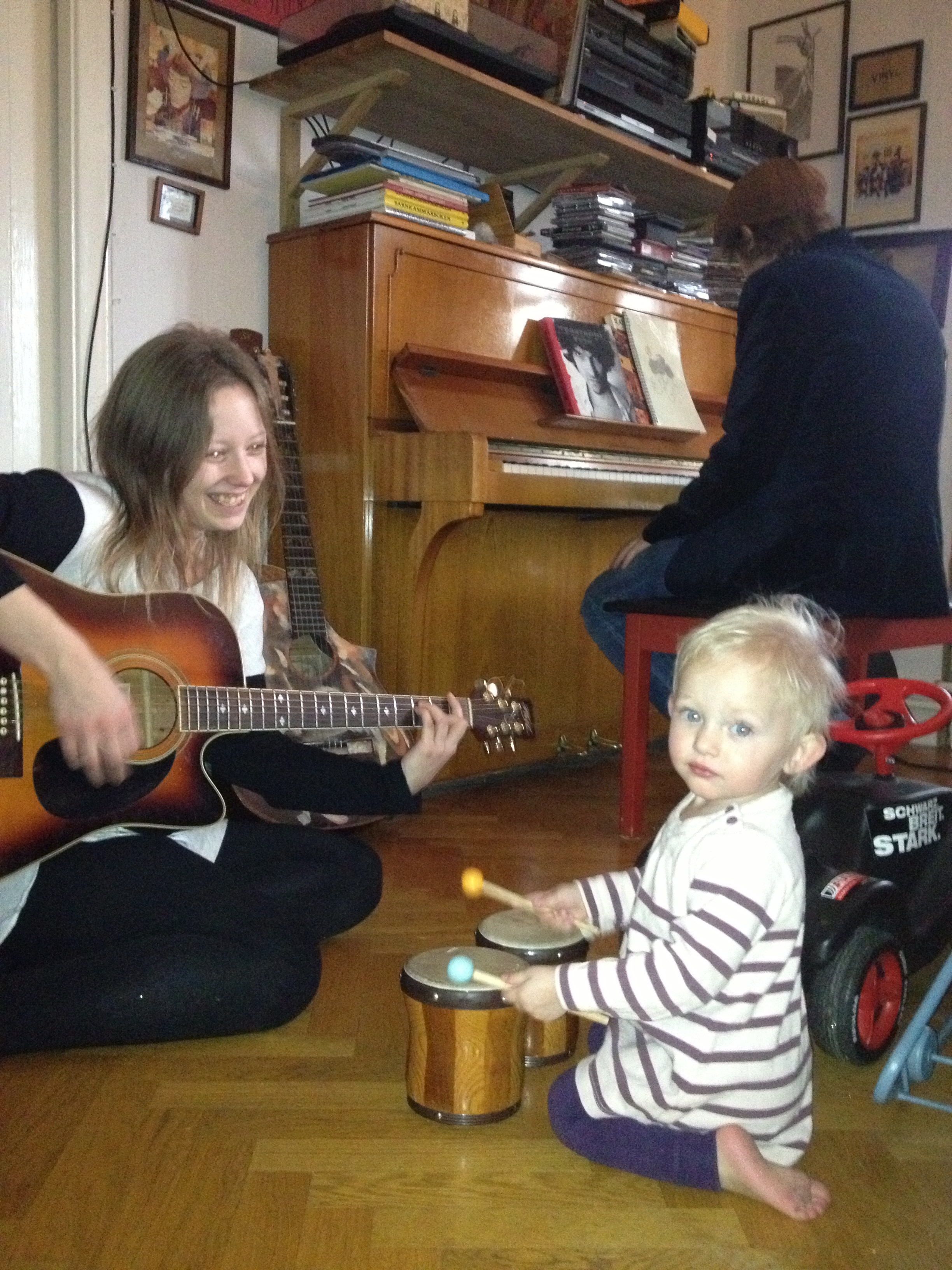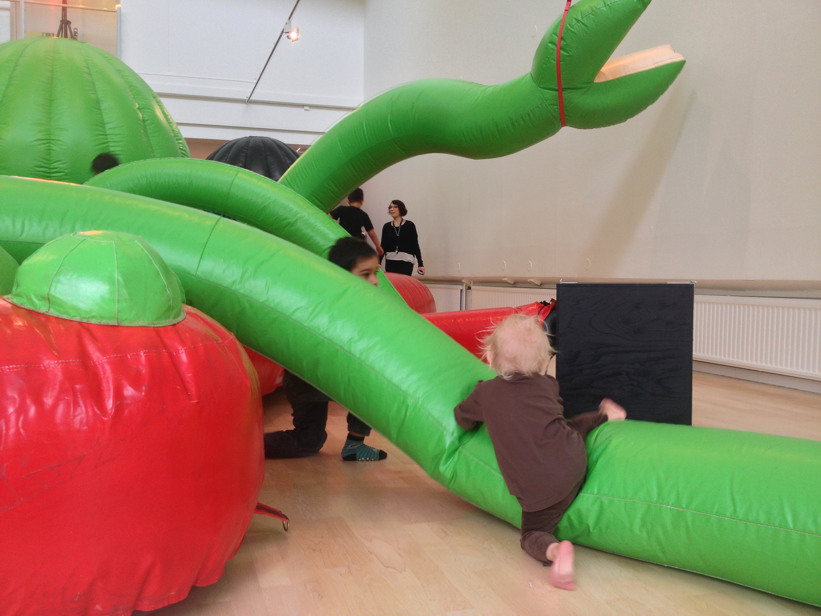 Med en ihoprullad egenritad teckning under armen, tackar Ella för sig, vinkar ivrigt och säger: ej då, till alla. Sedan följer hon i storebrors strumphälar ut till mycket små gummistövlar i kapprummet. Hon häktar ner jackan från kroken och stövlar raskt mot dörren. Nu väntar gymnastiken med dagiskompisar och föräldrar. Det är också ett äventyr.