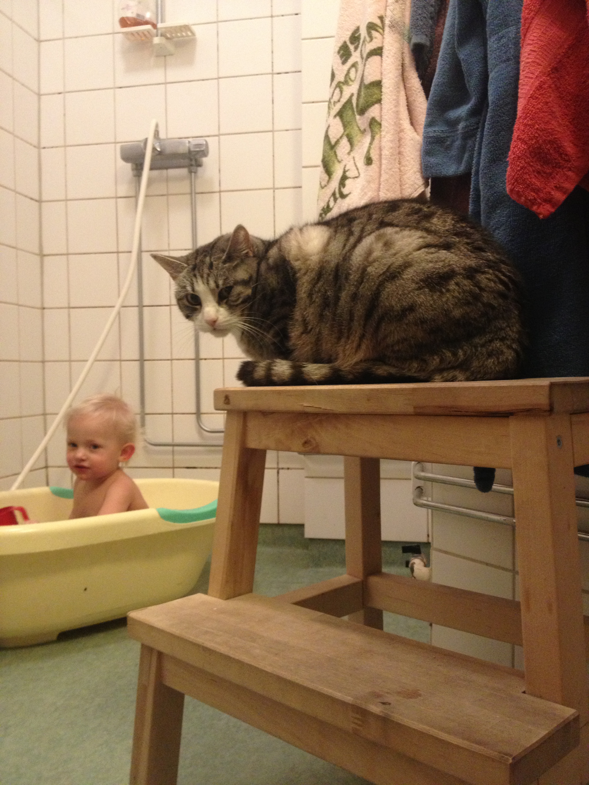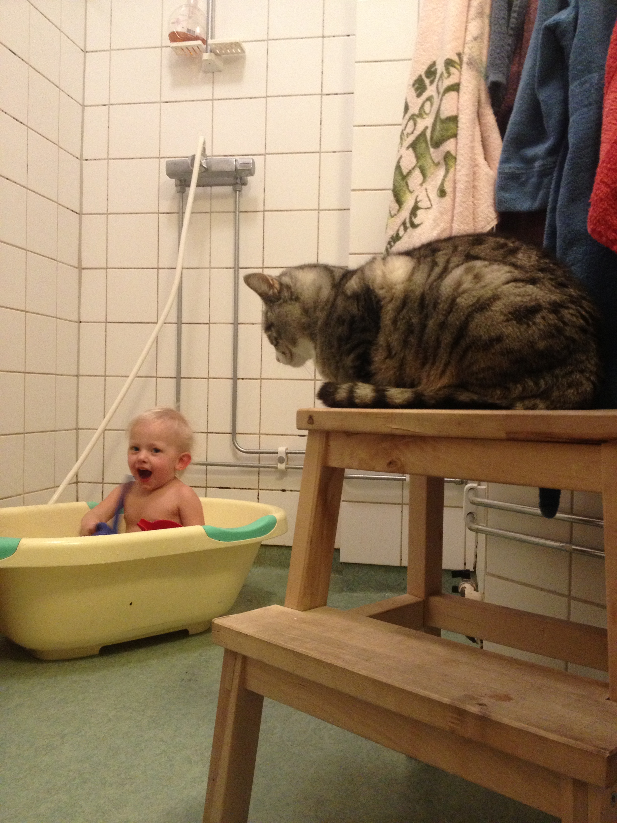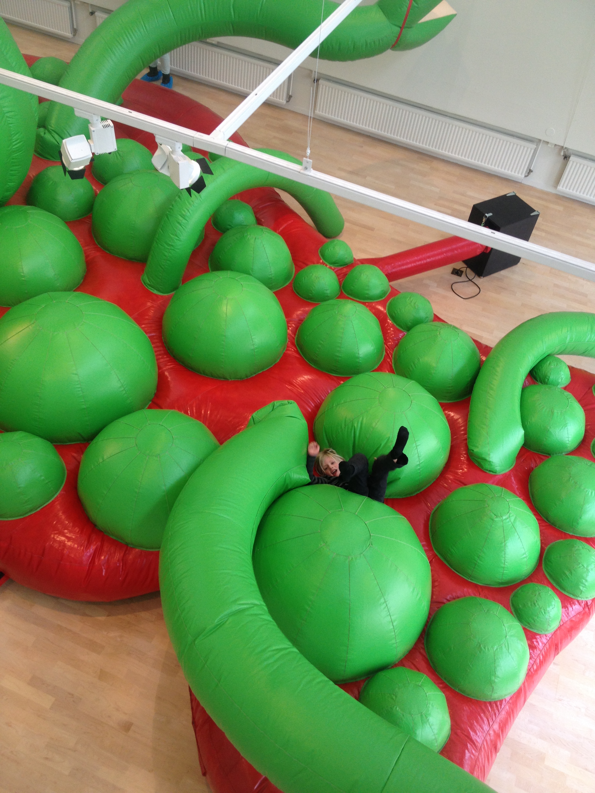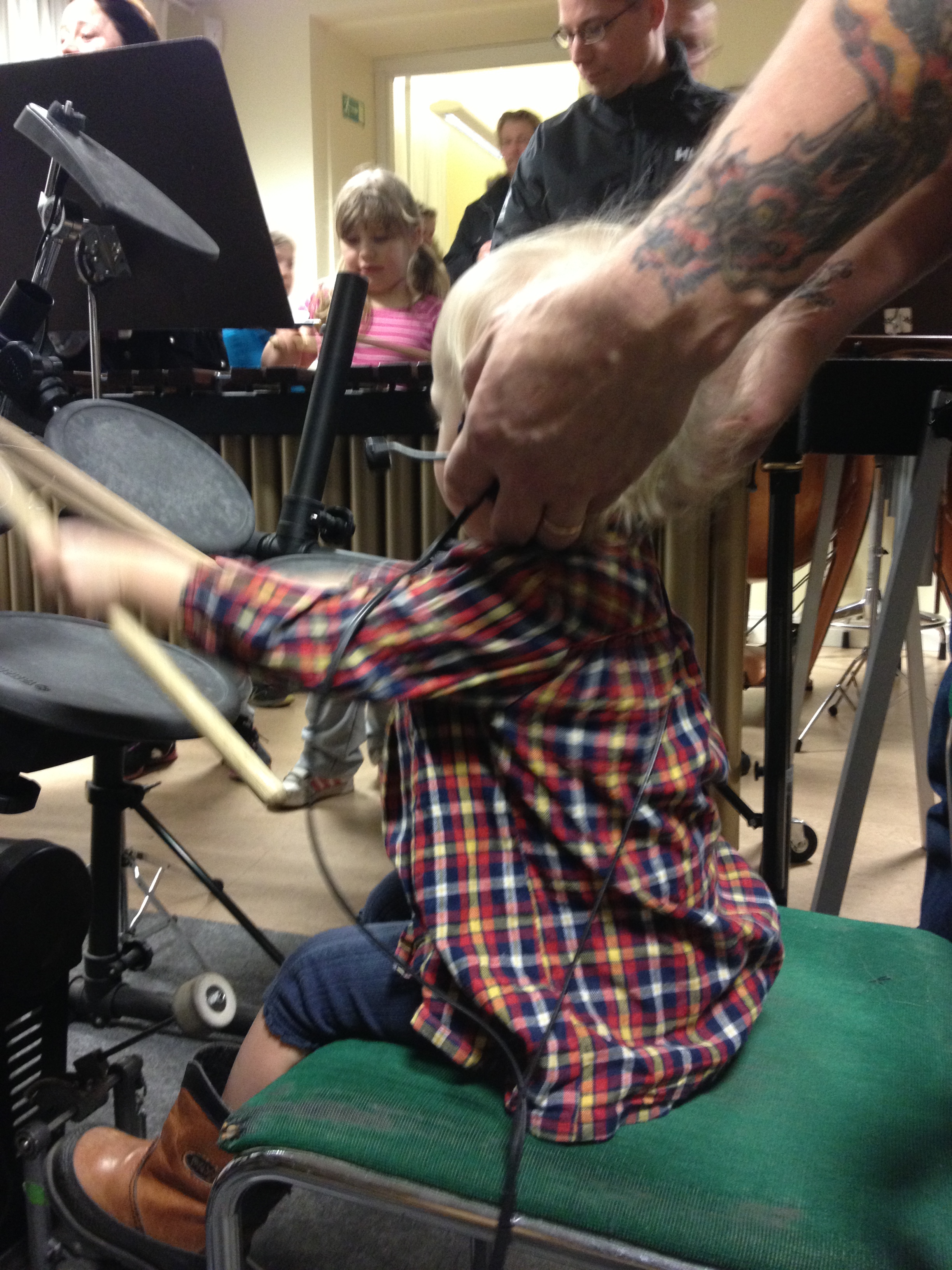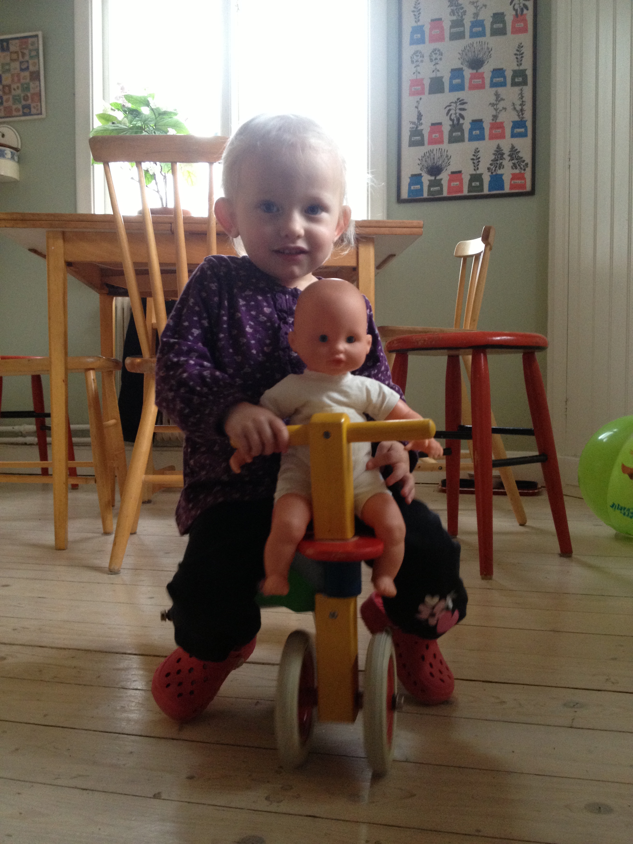 Med en ihoprullad egenritad teckning under armen, tackar Ella för sig, vinkar ivrigt och säger: ej då, till alla. Sedan följer hon i storebrors strumphälar ut till mycket små gummistövlar i kapprummet. Hon häktar ner jackan från kroken och stövlar raskt mot dörren. Nu väntar gymnastiken med dagiskompisar och föräldrar. Det är också ett äventyr.