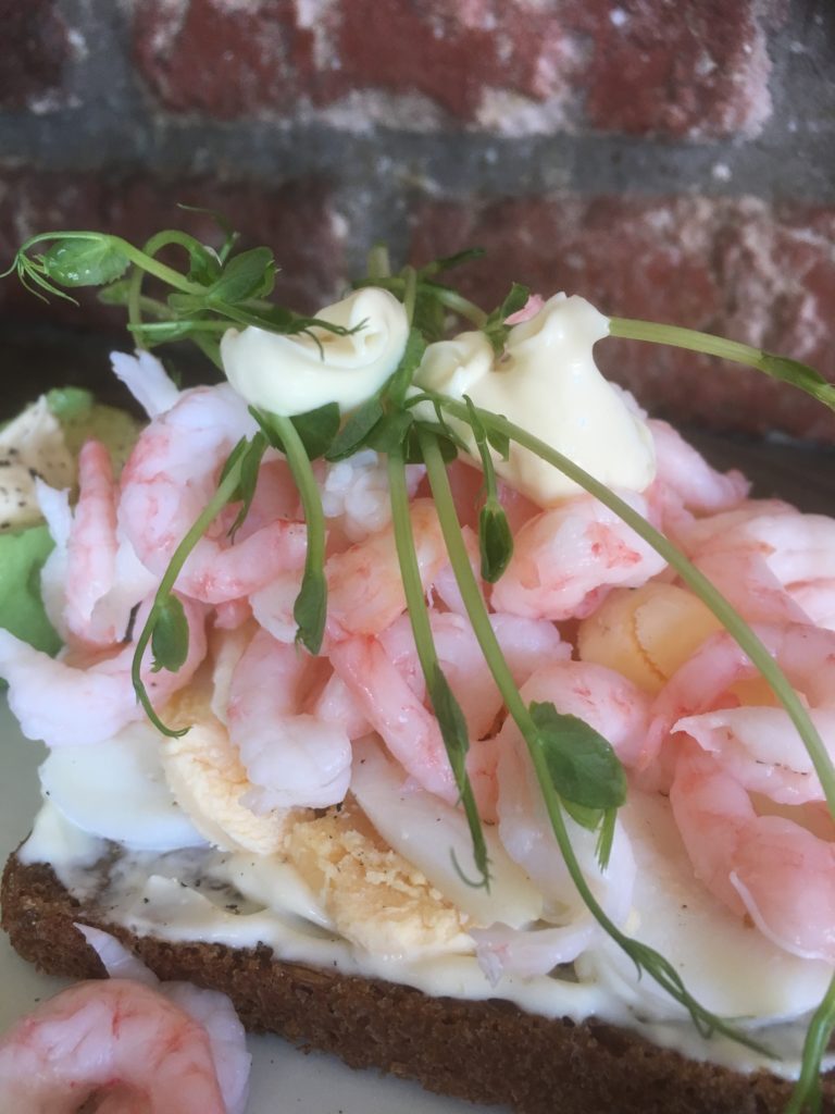 En egensvarvad räkmacka hemma vid köksbordet.