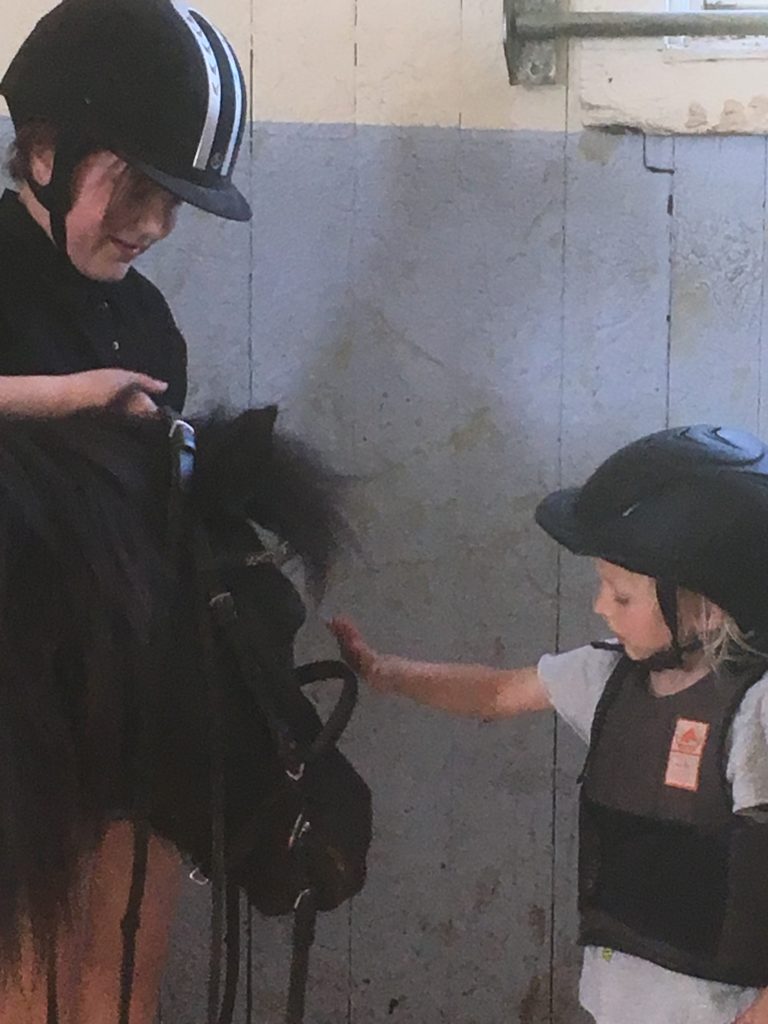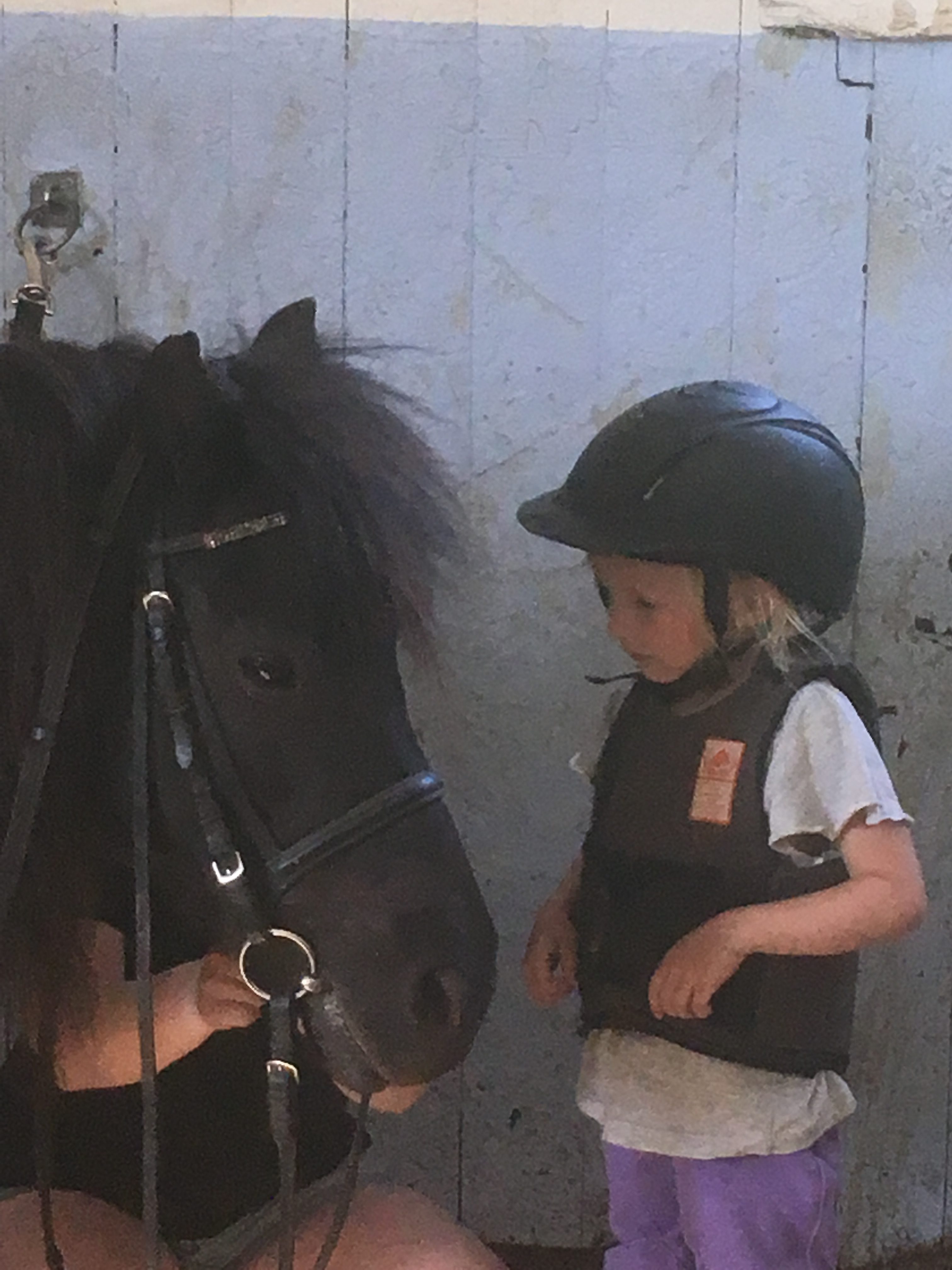 Bästaste, finaste Molly visar Ella hur man tar av hästens betsel efter ridlektionen.