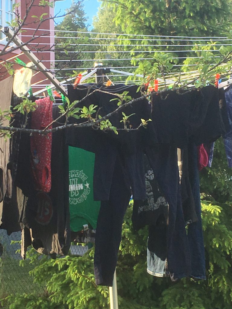 Hängde tvätt och solen kysste min nacke. Kände mig som en riktigt duktig fru… och så borde vi väl spara in lite energi på detta.